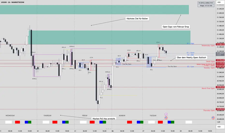 Gewinnmitnahme in der Asia-Session, danach aber auch Pump. Wir sind über dem März, Wochen und Tages True Open. Was anderes als bullisch kann man da guten Gewissens nicht sein, nächstes Ziel ist das letzt e Hoch um 21300, Bären sollten sich ab 21100 wieder für die Sache interessieren, dazwischen ist viel Lärm um nichts