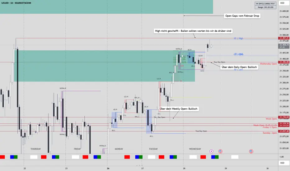 Auch heute stehen die Stene noch nicht gut für die Bären, über dem TagesOpen, über dem WochenOpen.. allerdings steht es um die Bullen heute nicht besser. Wir haben es nicht geschafft, dass High von vor einer Woche zu überschreiten bevor wir also nicht solide über 21488 sind würde ich heute eher die Finger vom Markt lassen. Ne MEnge Richmond Fed Data ab 16:00, Fed Speaker, heute abend noch FOMC Minutes, paar Bonds Auktionen.. da wird viel Geld verbraten bis es evtl. eine solide Richtung gibt. Ich muss später wie immer ins Training... setze vermutlich aus, oder schaue heut Abend nochmal