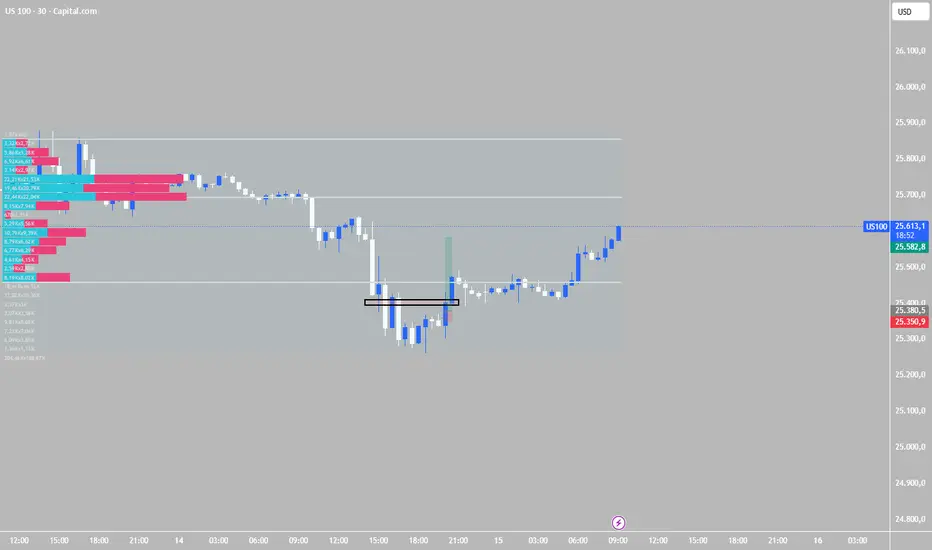 Mit hilfe des Volumens habe ich diesen Einstieg gesehen. Wir hatten fast kein Volumen in dieser Area = POC und VAL/VAH waren weiter oben. Dazu kommt, dass das Delta Volumenprofil auch long gerichtet war.