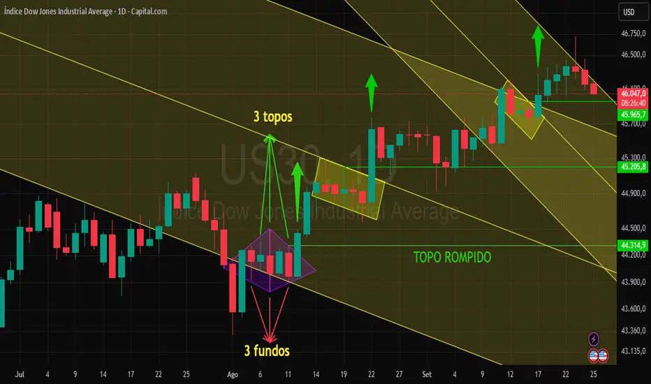 Diamante perfeito, simplesmente nunca vi uma diamante tão simétrico como esse do US30, 3 topos e 3 fundos, rompeu o último topo e disparou pra cima, depois formou duas bandeiras de alta e foi mais pra cima.
