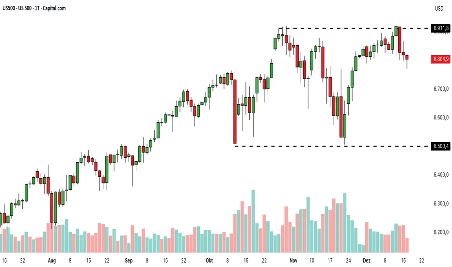 Der US500 zeigt nun erste Hinweise darauf, dass sich eine Seitwärtsrange entwickeln könnte. Die Korrektur im November hielt klar an den Oktober-Tiefs, gefolgt von einem stetigen Anstieg zurück in die November-Hochs, bevor die Dynamik ins Stocken geriet. Der Markt testet damit effektiv beide Grenzen eines entstehenden Korridors – die Frage ist nun, ob diese Konsolidierung die dominierende Struktur bis zum Jahresende wird.