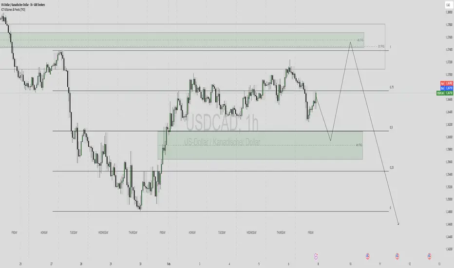 In einem anderen Beitrag von ich auf ein mögliches Long des EUR/USD eingegangen. Der Markt USD/CAD hier nach laufen. Eventuell zeigt der Kurs ein Retracement in das bullisches H4 FVG, reagiert nach oben in das Hoch und dann vom D1 FVG wieder tiefer. Die kommende Woche wird zeigen was der Kurs macht