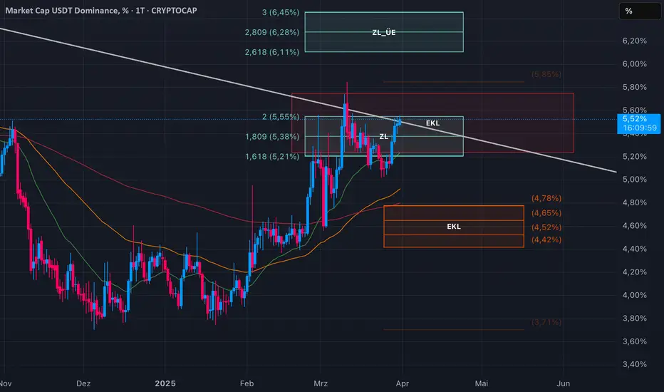 Ich habe mir heute mal wieder die USDT Dominance angeschaut. Aktuell stehen wir in einem Bullischen Zielbereich (ZL) und dem EKL in rot. Um weitere Kurssteigerungen bei BTC & Co sehen zu können, wollen wir einen fallenden Kurs bei der USDT Dominance sehen. Ich muss allerdings mit den Daten arbeiten die mir der Chart her gibt. Der Chart gibt der Dominance die Möglichkeit noch die zweite Zielzone (ZL_ÜE) anzulaufen. Sollte das geschehen, werden wir in Bitcoin und den Altcoins noch einmal einen größeren Rücksetzer sehen. Wollen wir hoffen das uns dies erspart bleibt. Ich würde jetzt gern den Ausbruch der Dominance in Richtung orangenes GKL unter uns sehen wollen. Wir dürfen auf keinen Fall das lokale Top bei 5.85% nach oben brechen. Sollte das passieren können wir davon ausgehen das wir in die obere Zielzone laufen.