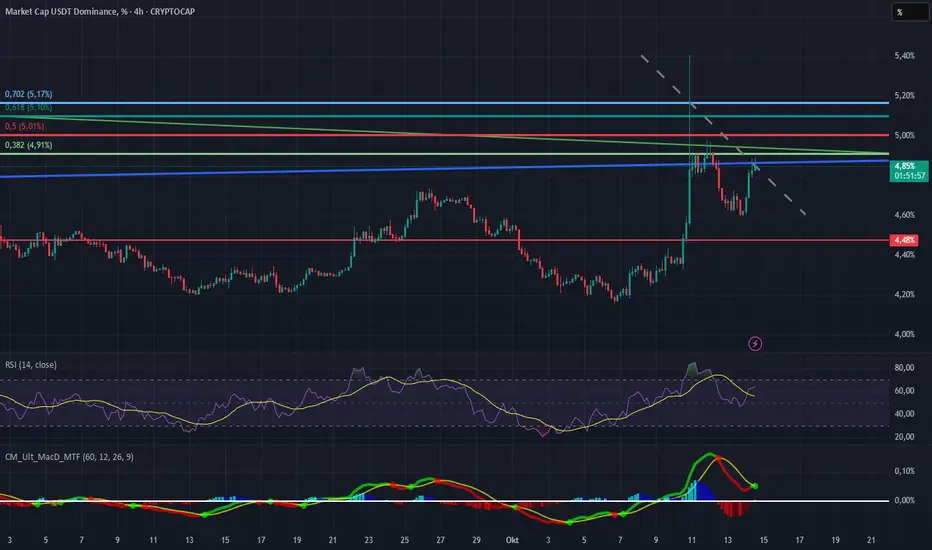 Die Dominanz läuft jetzt gegen den kurzfristigen Abwärtstrend (graue Linie) und trifft genau auf den Fibonacci-Cluster zwischen 4,91 % – 5,17 %.