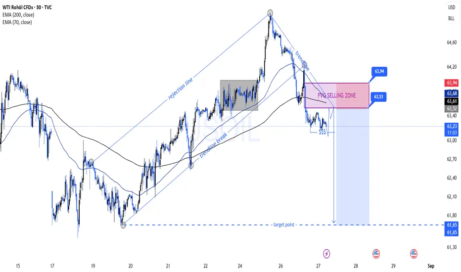 FVG (Fair Value Gap) Verkaufszone: Der Kurs testete die Ungleichgewichtszone (63.53–63.94) erneut, was eine starke Verkaufsgelegenheit schafft.