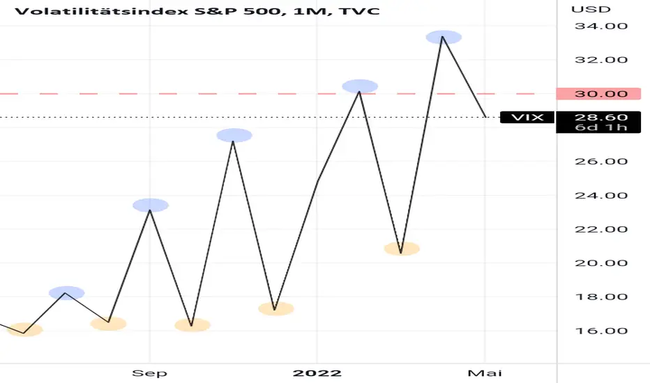 Ich hatte in einem älteren Beitrag auf ein VIX-Muster hingewiesen (GrimsV ebenfalls), dass sich nun wie oben gezeigt fortgeführt hat. Aktuell ist die Frage, ob sich dieses Muster über die historisch relevante Marke bei 30 fortsetzen kann, da hier in der Vergangenheit häufig Widerstände auftraten.