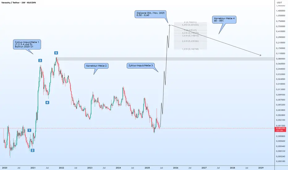 Unter Berücksichtigung der Tatsache, dass dieses Projekt mit hoher Wahrscheinlichkeit bereits die Korrekturwelle 2 abgeschlossen hat, sollte in den kommenden Monaten eine erwartbare Zyklus-Impulswelle 3 folgen. Diese könnte VRA auf mindestens 0,50 bis 0,60 USD bringen. Vom aktuellen absoluten Tief der Korrekturwelle 2 entspräche das einer Steigerung von mindestens 520x bis 620x.