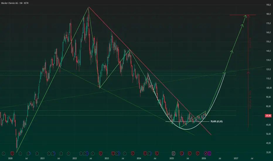 Im Bereich um 60–65 € hat sich in den letzten Monaten eine stabile Unterstützungszone gebildet. Auffällig ist dabei die runde Bodenformation (Cup-ähnlich), die häufig als Bodenbildungsstruktur interpretiert wird.