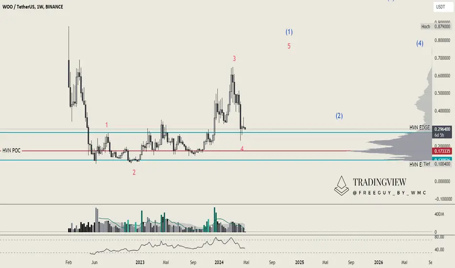 Auf dem Wochenchart von WOOUSDT scheint es, dass wir uns am Ende der Welle 4 oder sehr nahe daran befinden. Dies wird aus dem leichten Eindringen der Welle 4 in das Niveau der Welle 1 abgeleitet. Auf dem volatilen Kryptowährungsmarkt wird ein solch geringfügiger Verstoß von uns nicht als echter Bruch des Niveaus der Welle 1 angesehen, was akzeptabel ist, solange es nicht zu weiteren Rückgängen führt.