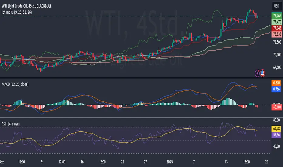 Der WTI-Preis zeigt eine gemischte Entwicklung, nachdem er jüngst an Dynamik verloren hat. Die Konsolidierung deutet darauf hin, dass der Markt auf frische Impulse wartet. Nach einem Rückgang von den jüngsten Hochs bei 79,35 USD stabilisierte sich der Preis oberhalb der wichtigen Unterstützungsmarke von 77,50 USD. Diese Zone bleibt entscheidend für die mittelfristige bullische Struktur.