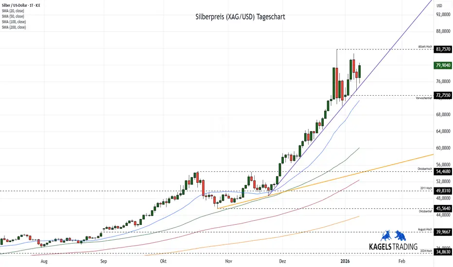 Das im zweiten Halbjahr 2025 etablierte Ausbruchsszenario setzte der Silberpreis nach kurzem Ringen an der $50er-Marke eindrucksvoll fort, muss sich nach seinem Rekordhoch über $83 zunächst jedoch an der $70er-Marke stützen.