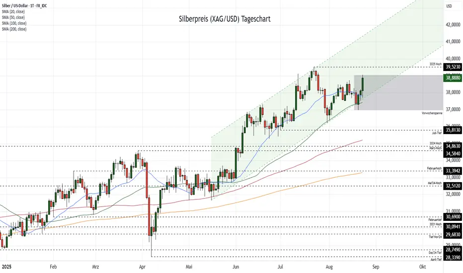 Nach der im Oktober 2024 begonnenen Korrektur hat der Silberpreis zu Jahresbeginn in eine Aufwärtstrendstruktur gedreht und im März den Widerstand am Vorjahreshoch angelaufen. Dort setzte jedoch ein massiver Abverkauf ein, von dem sich der Kurs nach dem April-Tief bei $28,33 ebenso stark erholen konnte und in einem deutlichen Ausbruch das Jahreshoch bei $39,52 markiert hat.