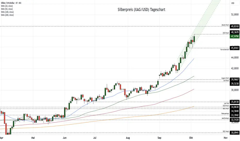 Nach der im Oktober 2024 begonnenen Korrektur hat der Silberpreis zu Beginn des Jahres 2025 in eine Aufwärtstrendstruktur gedreht und im März den Widerstand am Vorjahreshoch angelaufen. Dort setzte jedoch ein massiver Abverkauf ein, von dem sich der Kurs nach dem April-Tief bei $28,33 ebenso stark erholen konnte und in einem bis jetzt in den Oktober laufenden Ausbruchsszenario das Jahreshoch bei $48,36 gesetzt hat.