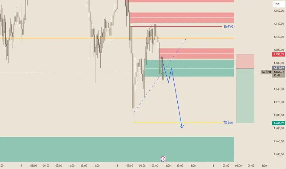 Sobald dieser Support bricht, werden wir ziemlich sicher, einen Abverkauf auf das Tokyo-Low (🟡gelbe Linie) bestätigen und könnten einen re-Test der FVG als 🔴Short Entry nutzen. Es wäre kein Problem das SL an die Highs zu ziehen, da wir auch so ein knappes 1:4er RRR erreichen würden - aufgrund der Größe der 5min-FVG ist aber eventuell auch ein internes 1min-Setup möglich, welches den Trade nochmal kompakter gestalten würde. Wofür wir uns entscheiden, werde ich euch mitteilen, sobald das Setup entsteht und euch dann die genauen Daten für den Trade geben.