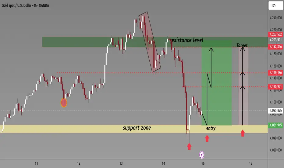 Der Kurs ist stark in die gelbe Unterstützungszone (ca. 4.060–4.070) gefallen.