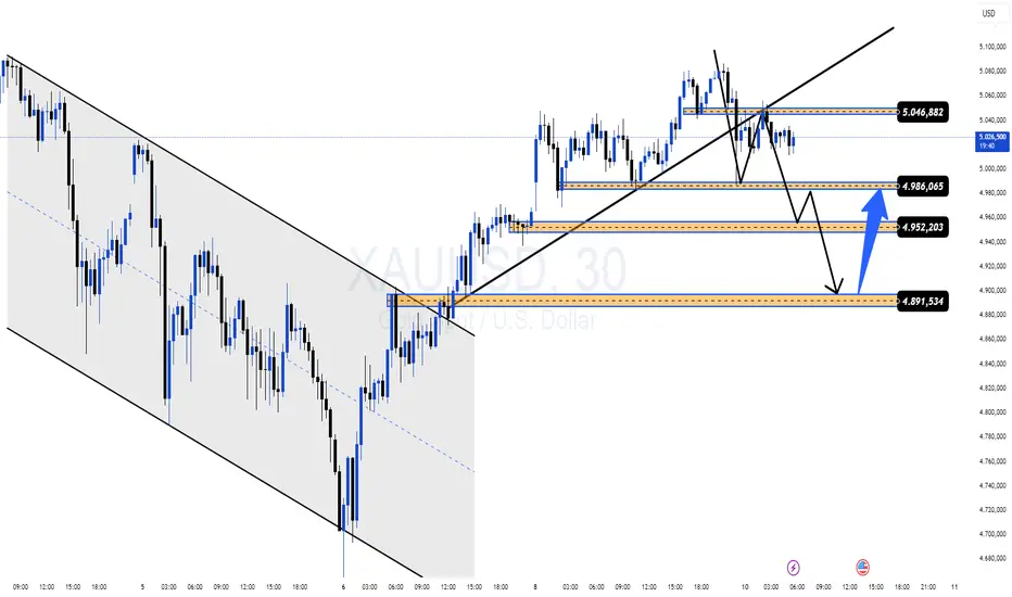 Gold handelt in einer starken volatilen Phase auf M30, nachdem es aus dem absteigenden Kanal ausgebrochen ist und in eine kurzfristige bullish Struktur übergegangen ist. Der Preis tritt jedoch nun in ein Entscheidungsgebiet ein, in dem Fake-Ausbrüche und tiefe Rücksetzer sehr wahrscheinlich sind.