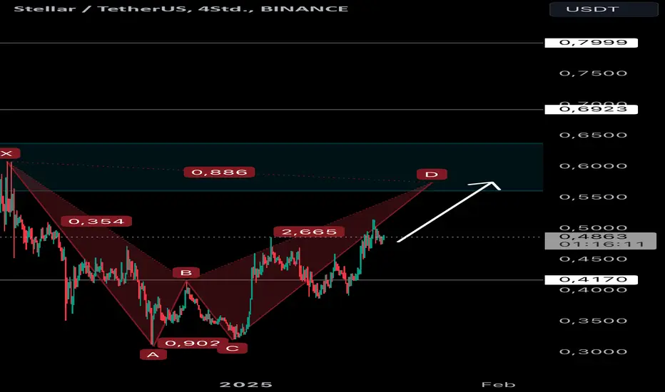 Bei einem Preis von circa 0.5756$ würde sich bei XLM Stellar ein bearishes BAT Pattern bilden. Solange wir die 0.417$ halten ist meiner Meinung nach XLM mehr als bullish gelaunt. Let‘s get it 🚀