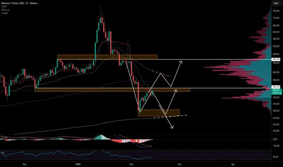 Monero befindet sich im Daily-Chart nach dem impulsiven Anstieg auf ein neues Allzeithoch in einer ausgeprägten Korrekturphase. Der Rücklauf erfolgte dynamisch und ohne größere Zwischenkonsolidierungen – ein klassischer Momentum-Abbau nach einer parabolischen Bewegung.