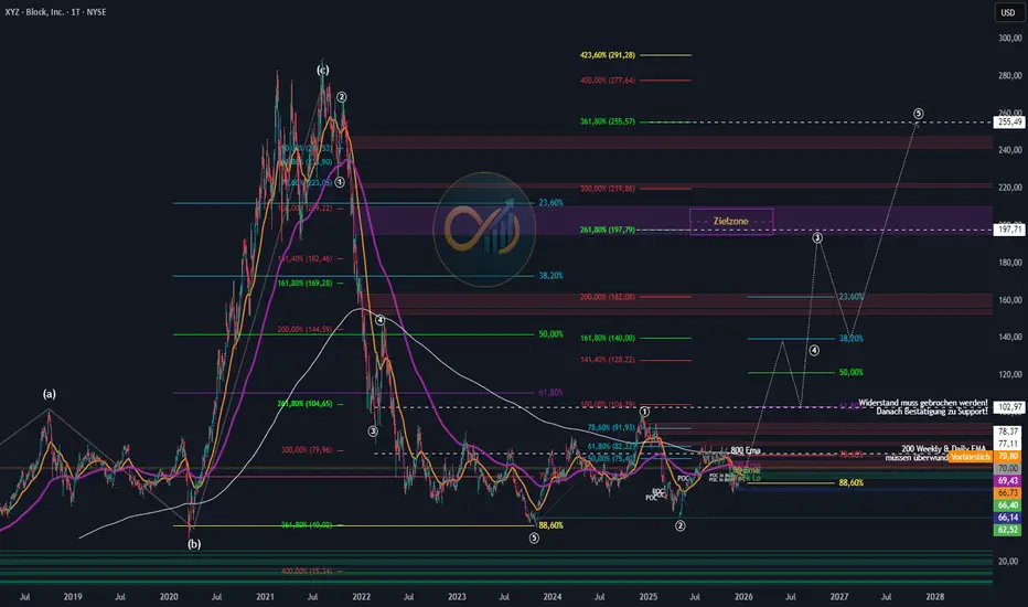 Block Inc. befindet sich **nicht in einem Trendbruch**, sondern in einer **langwierigen Bodenbildungsphase** nach der massiven Überbewertung 2021.