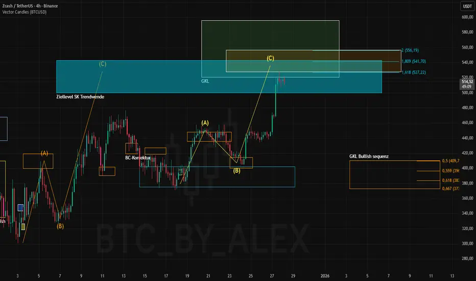 Auf Basis der aktuellen Struktur rechne ich nun mit der Ausbildung eines GKL innerhalb der bullischen Sequenz. Daraus ergibt sich ein potenzielles Korrektur-Ziel-Level im Bereich von 410 USD bis hinunter auf 373 USD.