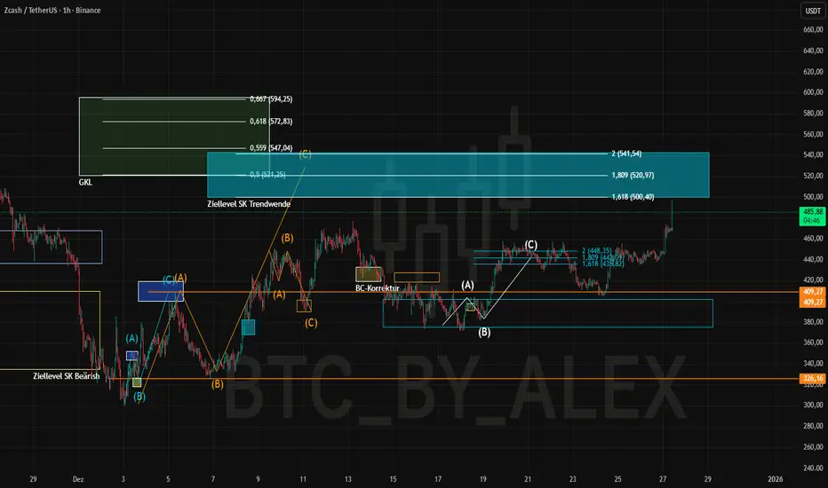 ZCash nähert sich planmäßig seinem Ziel-Level im Bereich von 500 bis 541 USD. Wie erwartet bewegt sich der Kurs kontinuierlich in diese Zone, begleitet von gesunden, leichten Korrekturen innerhalb des Aufwärtstrends.
