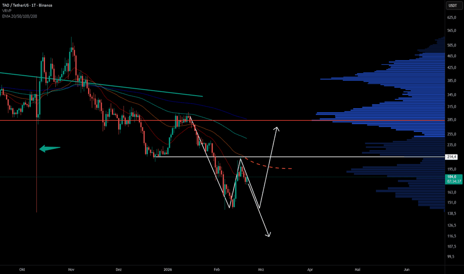 TAO bleibt erstmal schwach. Hält die Zone um 140–150 USD nicht, steigt das Risiko einer tieferen Korrektur deutlich. Erst ein bestätigter Doppelboden mit Momentum würde das Bild nachhaltig stabilisieren.