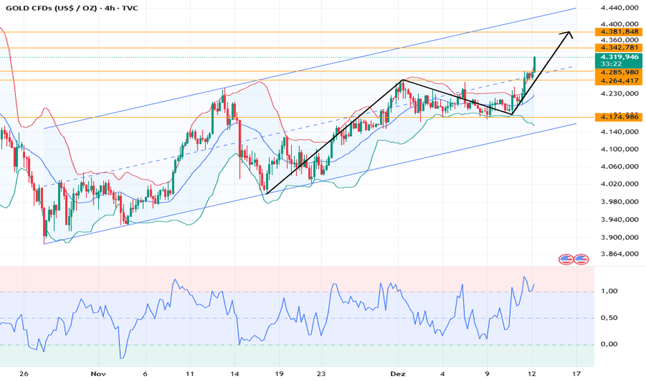 Im Tageschart zeigt Gold eine starke Performance mit einem anhaltenden Aufwärtstrend. Die gleitenden Durchschnitte kreuzen sich nach oben, die Unterstützungsniveaus steigen sukzessive an, und die Bollinger-Bänder dehnen sich nach oben aus. Nach diesem Ausbruch ist eine weitere Aufwärtsbewegung unausweichlich. Der Preis steigt. Das heutige Unterstützungsniveau liegt bei etwa 4265, dem Bereich, in dem sich Hoch und Tief umkehrten.