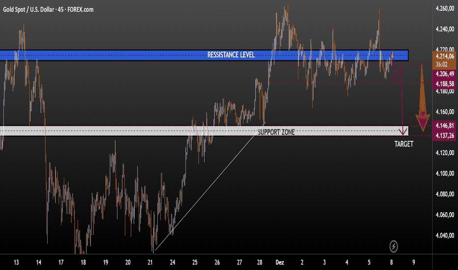 Der Chart deutet auf eine bärische Korrektur hin. Die wiederholte Abweisung an der Widerstandszone sowie der Bruch der Aufwärtstruktur sprechen für einen Rückgang in Richtung 4137–4147.