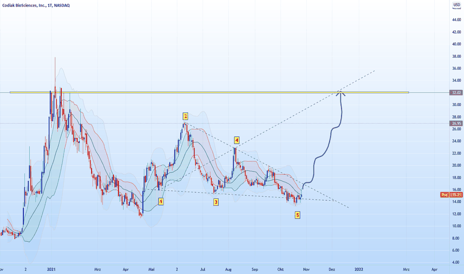 Wolfe Wellen Formation bei Codiak BioSciences Inc. Bei Codiak BioSciences, Inc. hat sich eine Wolfe Wave Formation im letztem Stadium ausgebildet!