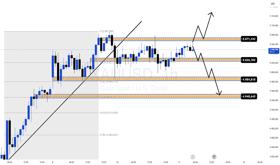 XAUUSD H1 – Falscher Ausbruch oder Expansion zu 5,448?Gold komprimiert sich unter einem größeren Ungleichgewicht, während makroökonomische Unsicherheit die Volatilität hoch hält. Das ist ein klassisches Liquiditätsumfeld — entweder ein falscher Ausbruch, um Stop-Loss-Positionen zu räumen, oder eine saubere Expansion in Richtung höherer Liquidität.