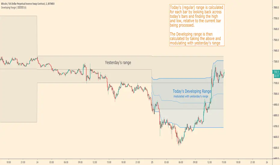 Note: we do not use the DAILY bar via 'security()' to obtain today's high and low. This would essentially be forward looking, instead we use iteration to check from the current bar back to midnight, bar by bar. This then allows a developing range to be established as the day prints new highs and lows.