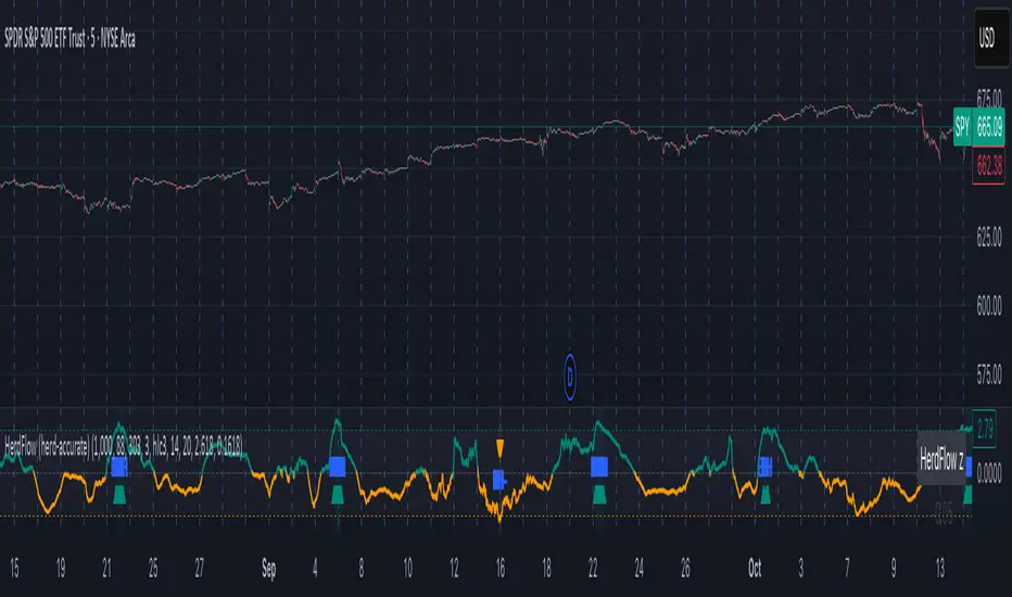 The Herd Flow Oscillator works as a multi-layer detector of crowd-driven flow in the market. It examines how signed volume (buy vs. sell pressure) evolves, how persistent it is, and whether those actions are unusually coordinated compared to random expectations.
