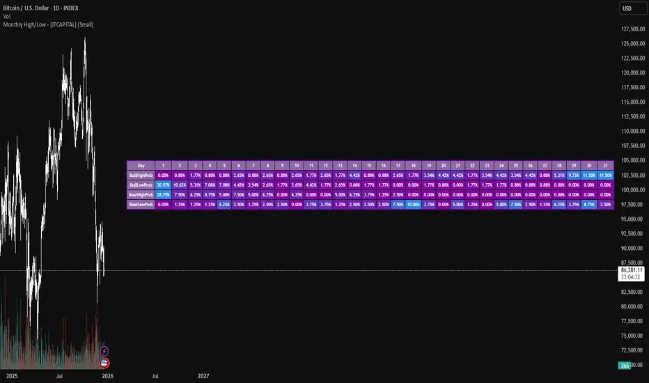 Monthly High/Low Probability Table - [JTCAPITAL] is a modified way to use historical monthly high and low tracking combined with probabilistic analysis for bullish and bearish months to detect potential patterns in monthly price behavior.