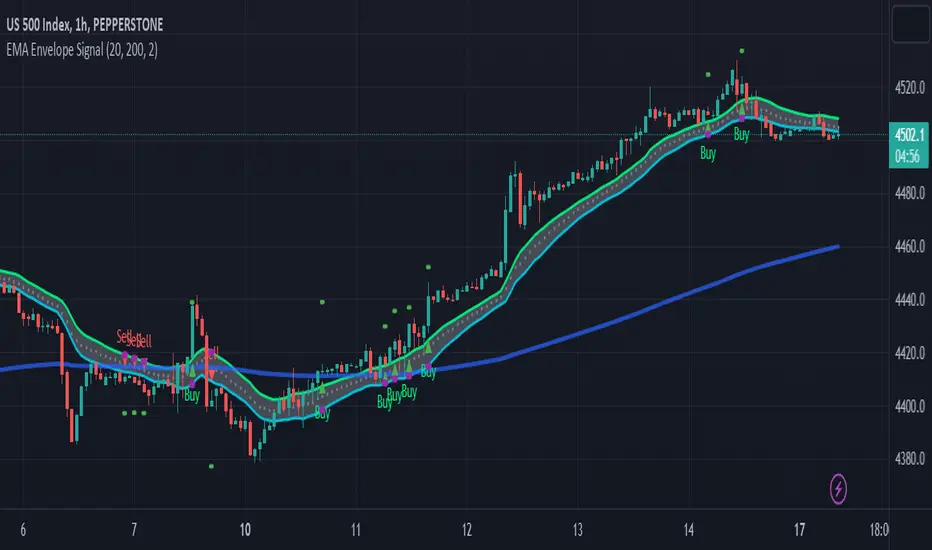 The indicator generates buy signals when the price crosses above the upper EMA envelope and the previous low was below the upper EMA envelope. Additionally, you can choose to filter buy signals based on whether the closing price is above the long-term EMA.