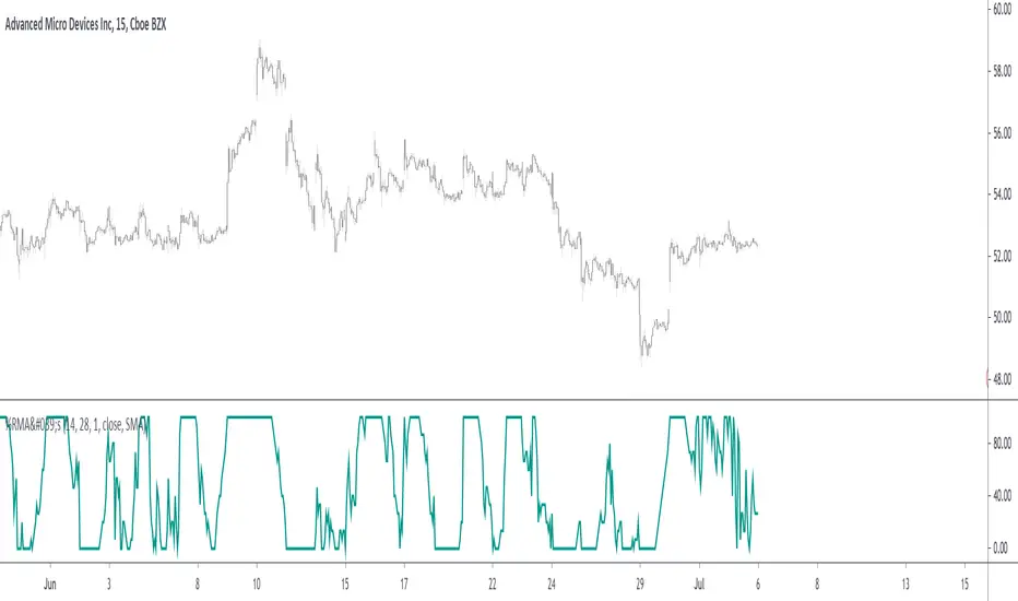 The strength of a trend can be determined by how close the indicator is to 0 or 100, a value of 100 would imply that 100% percent of the moving averages are rising, this indicates a strong up-trend, while a value of 0 would suggest a strong down-trend.