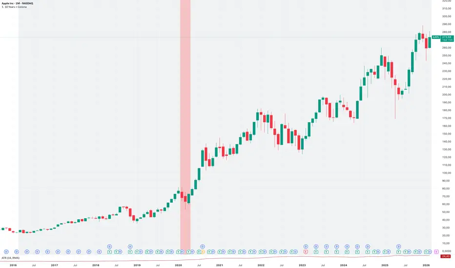 A clean visual lookback tool that highlights the most relevant 10-year window on the chart and marks the Covid period as a reference point. Built for orientation and consistent historical context.