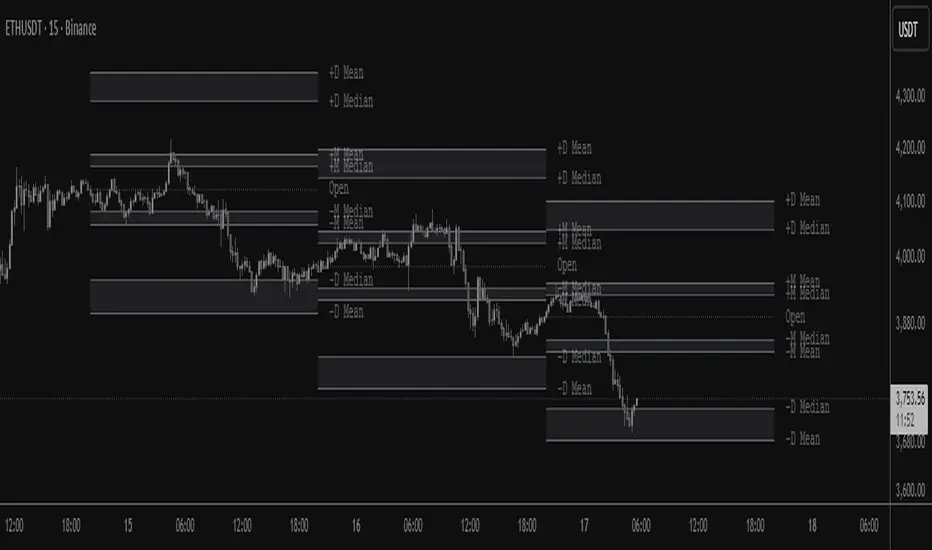 • Mean vs. Median Zones: The script plots levels based on both the historical mean (average) and median (middle value). The shaded area between them creates a zone rather than a single price line, offering a more practical range for analysis.