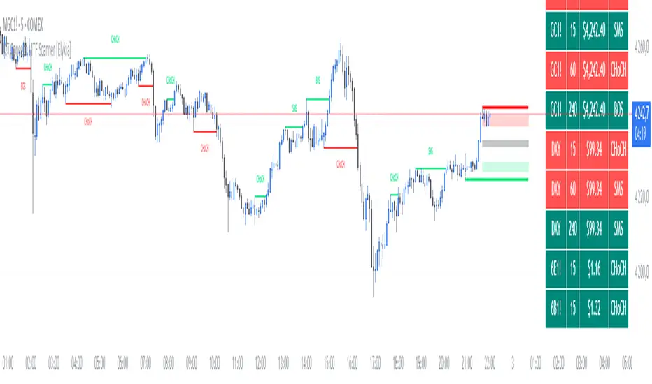 Stop switching tabs constantly. This indicator allows you to monitor the market structure (Trend, BOS, CHoCH) of 20 different assets simultaneously, each with its own custom timeframe.