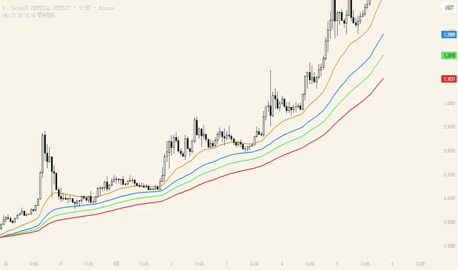 Multiple EMAs in One Script: Displays EMA 24, EMA 50, EMA 70, and EMA 99 simultaneously.
