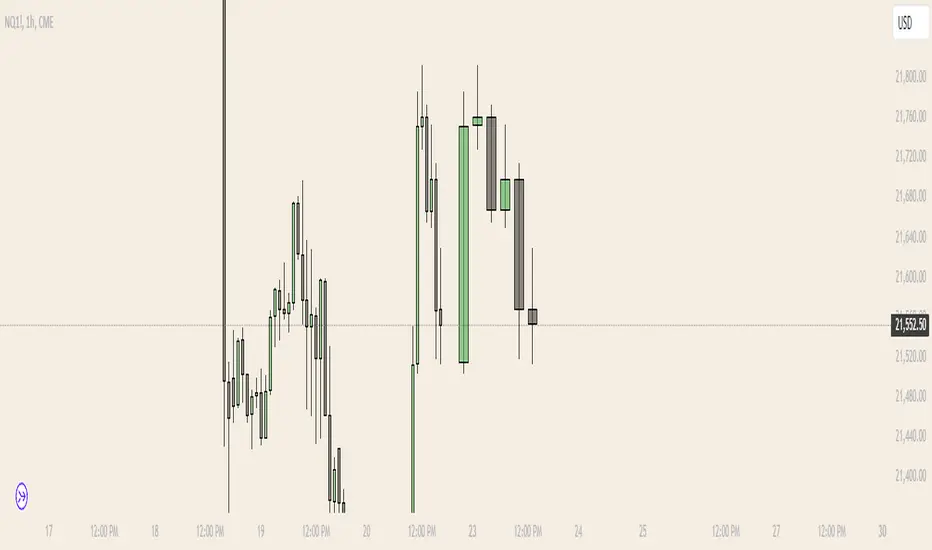 Color-Coding for Market Direction: The indicator automatically colors the body of the candles based on the market's trend. Green represents a bullish candle, while red represents a bearish candle, giving quick visual cues for price movement direction.