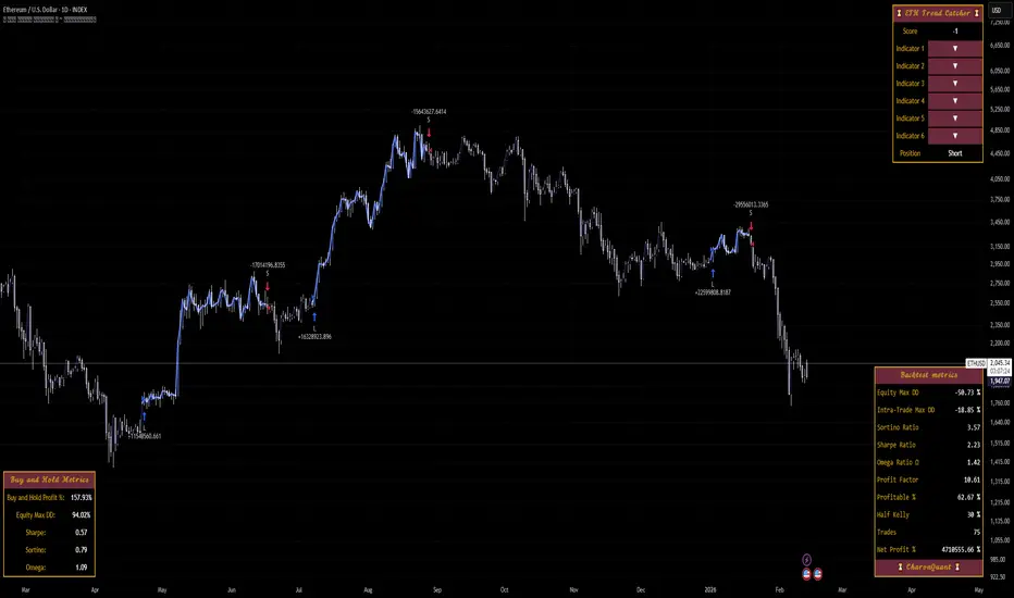 ⏳ 𝓔𝓣𝓗 𝓣𝓻𝓮𝓷𝓭 𝓒𝓪𝓽𝓬𝓱𝓮𝓻 ⏳ is a Trend Following algorithm engineered specifically to identify and confirm Ethereum’s primary directional moves on the daily chart.