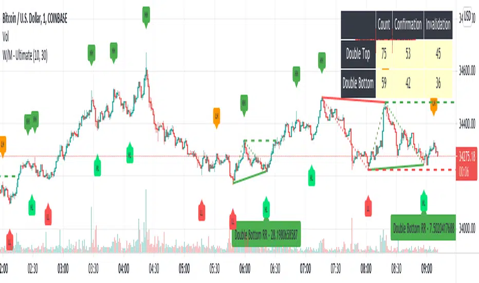 - Option to display stats which shows number of occurances of double top and bottom and how many times price crossed confirmation point and invalidation point (which are also marked with dashed lines) Stats are color coded. Higher success rates are colored in shades of green, lower success rates are colored in shades of orange whereas the neutral success rates are coloed in light yellow.