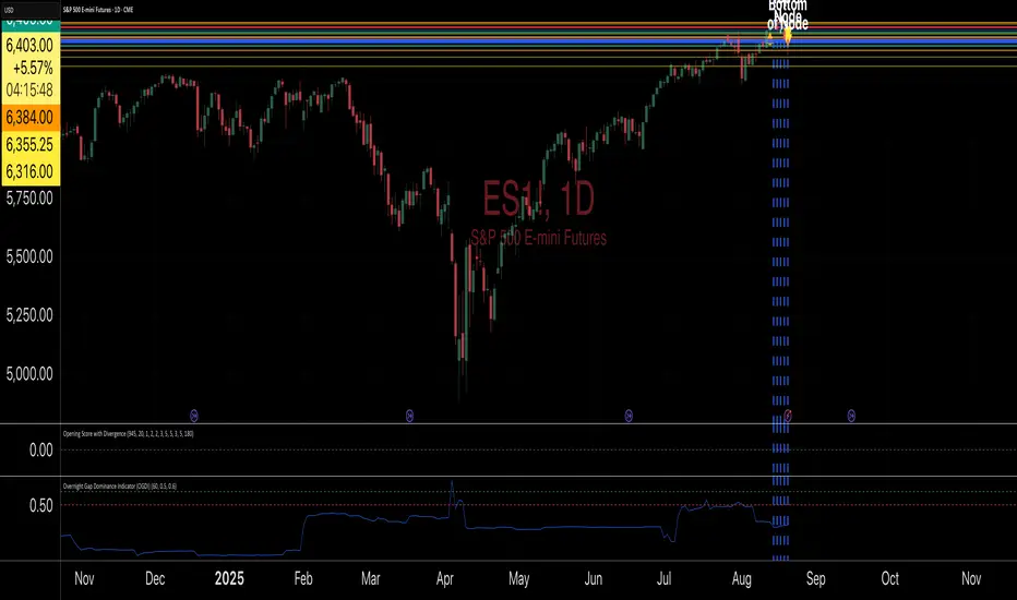 The Overnight Gap Dominance Indicator (OGDI) measures the relative volatility of overnight price gaps versus intraday price movements for a given security, such as SPY or SPX. It uses a rolling standard deviation of absolute overnight percentage changes divided by the standard deviation of absolute intraday percentage changes over a customizable window. This helps traders identify periods where overnight gaps predominate, suggesting potential opportunities for strategies leveraging extended market moves.