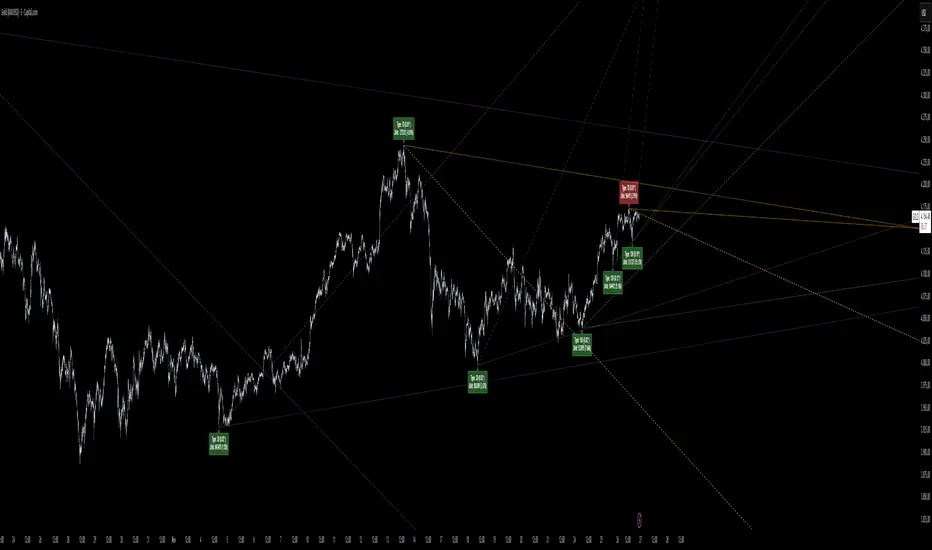 Whenever two matching pivots (High ↔ Low) of the same length are detected, the indicator calculates a true calendar-time angle and extends it forward, forming dynamic Gann-style fans that adapt to the market in real time.