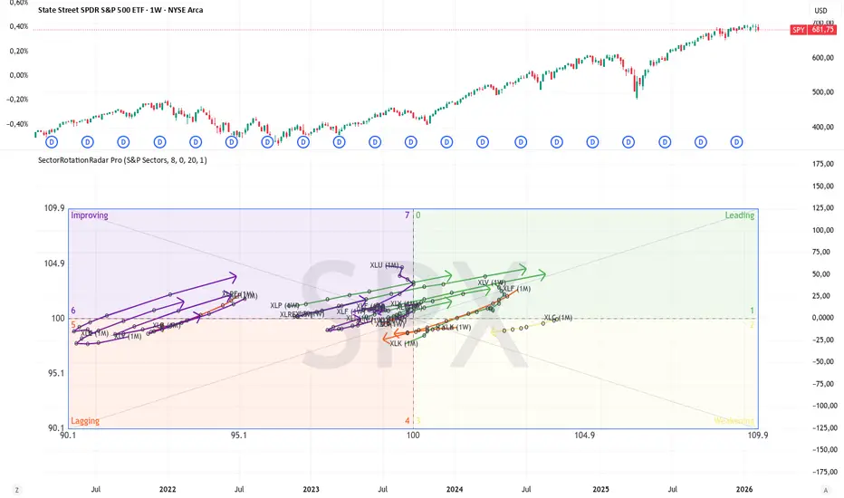 SectorRotationRadar Pro compares multiple symbols against a benchmark using a Relative Rotation Graph (RRG).