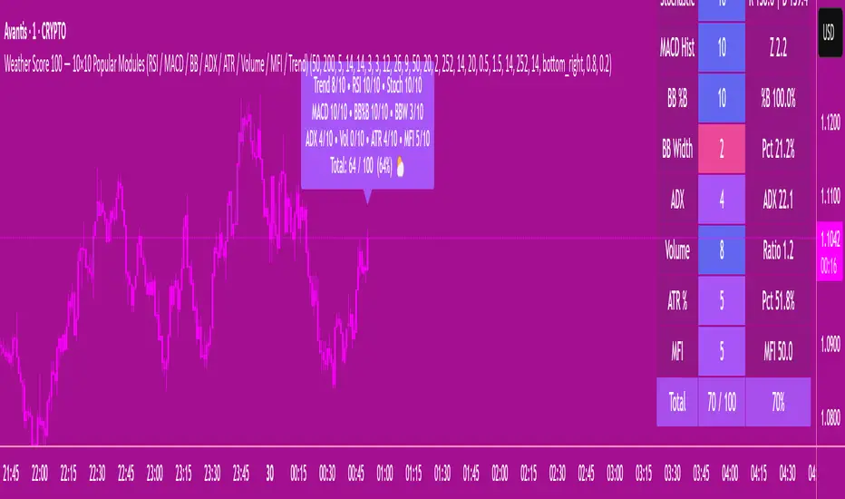 Weather Score 100 — 10×10 Popular Modules (RSI / MACD / BB / ADX / ATR / Volume / MFI / Trend)