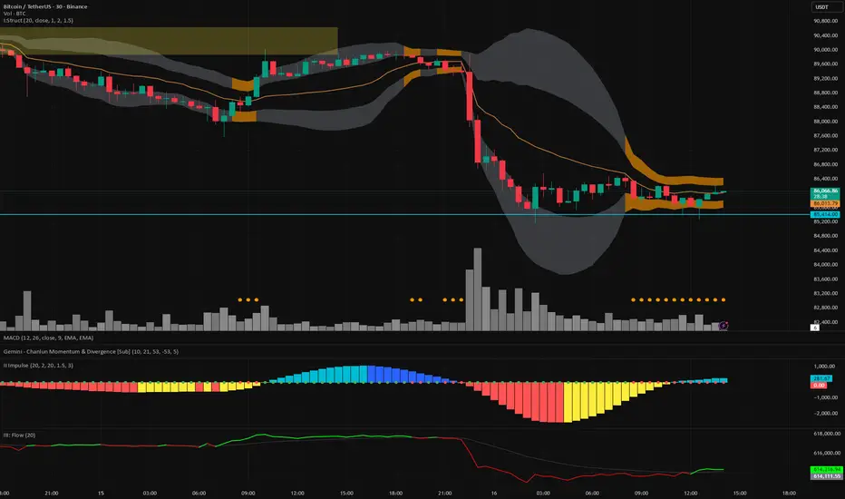 The indicator integrates a mechanical "Squeeze" detection based on the relationship between the Bollinger Bands (Variance) and Keltner Channels (ATR).