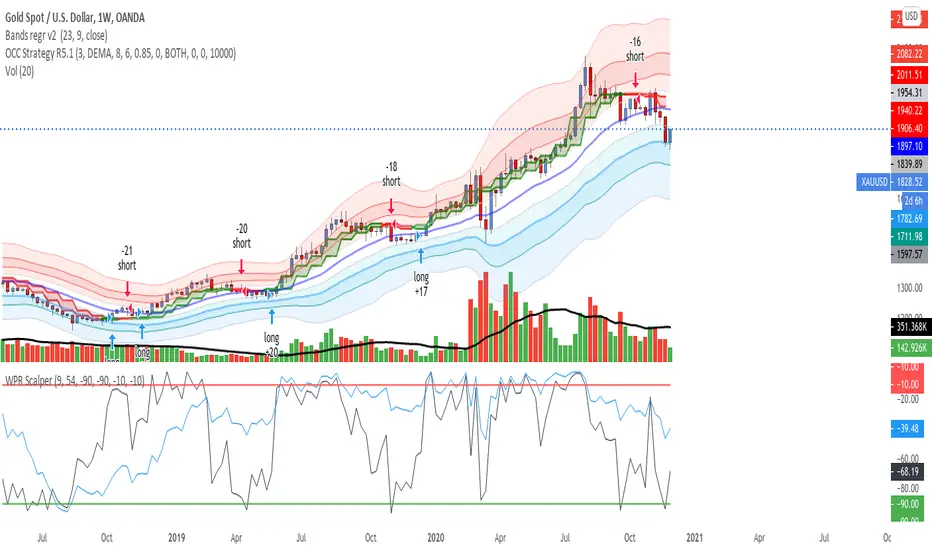 William %R Scalper or WPR Scalper tool is used with small time frame : 5 , 3 or 1 minute, it uses two different William %R indicators : one for fast move with 9 period WPR9 and one slow with 54 period WPR54. You can find buy zone when WPR9 < -90 and WPR54 < -80 and sell zone when WPR9 > -10 AND WPR54 > -20. For experience user only you can adapt the two periods and threshold levels to your need. You can use only WPR9 to place trade and validate trend with WPR54.Open-source Skript