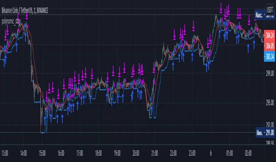 A strategy with a trailing stop in the form of a polynomial function. The entry is made at the intersection of a simple sliding closing candle. At the moment of entering the position, it is fixed by the value of the Minimum for the period. After entering the position, a trailing stop of the form is activated: Min + D * N^a, where Min is the minimum for the period fixed at the time of entering the position, D is the decrement, N is the number of bars in the position and a is the degree of the polynomial. At the moment when the trailing stop crosses the candle closing from the bottom up , the transaction is closed. The degree of a polynomial can be taken as integers and fractional numbers
