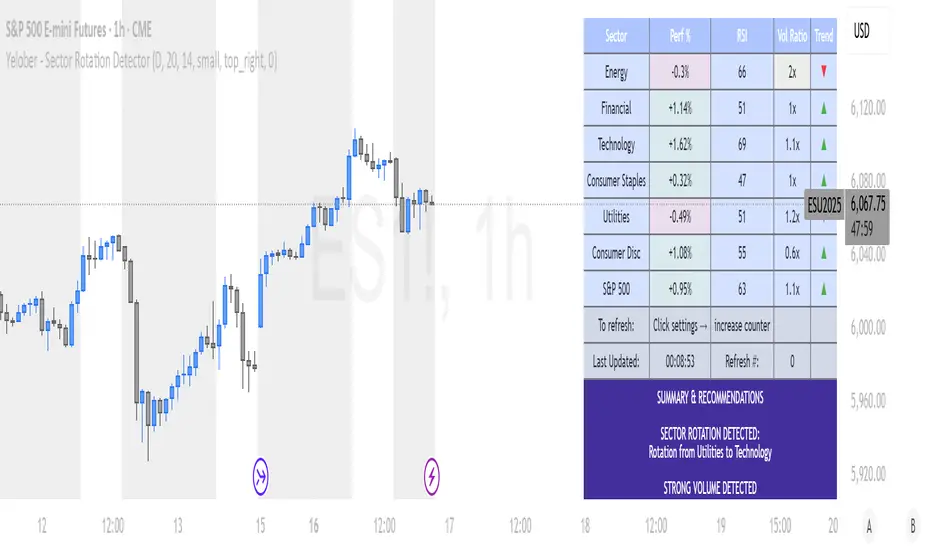 The Yelober - Sector Rotation Detector is a TradingView indicator designed to track sector performance and identify market rotations in real-time. It monitors key sector ETFs, calculates performance metrics, and provides actionable stock recommendations based on sector strength and weakness.